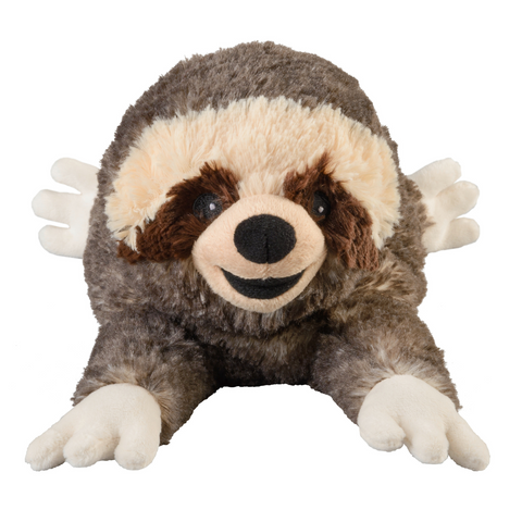 Das WARMIES® Faultier ist ein Plüschfaultier mit braunem Fell und cremefarbenem Gesicht und Pfoten, das flach auf dem Bauch liegt – Ihr kuscheliger Begleiter für Trost und ein Lächeln.