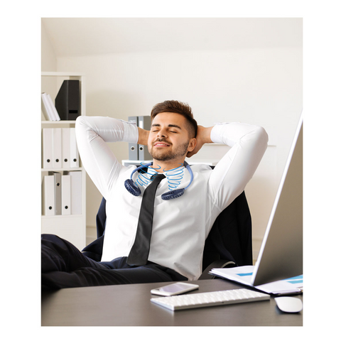 Der Nackenventilator Breezy verfügt über zwei kleine runde Ventilatoren, ein flexibles blaues Band, ein USB-Ladekabel, einstellbare Geschwindigkeitseinstellungen und ist für individuellen Kühlkomfort konzipiert.