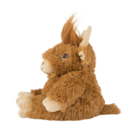 Das WARMIES® Hochlandrind ist ein Plüschkuhspielzeug mit langem braunem Fell, cremefarbenen Füßen, einem aufrecht stehenden, flauschigen Haarbüschel und einem beruhigenden Lavendelduft für zusätzlichen Komfort.