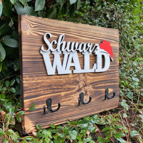 Das Schwarzwald-Schlüsselbrett „Christine“ ist ein im Schwarzwald-Stil gefertigtes Schlüsselbrett aus Kiefernholz mit vier Haken, das auf grünem Blätterboden in der Nähe von Büschen abgebildet ist.