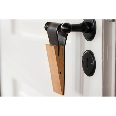 Der Türstopper Stoppermaus, ein hölzerner Türstopper in Mausform mit einer schwarzen Gummischlaufe, hält eine weiße Tür auf einem Holzboden offen.